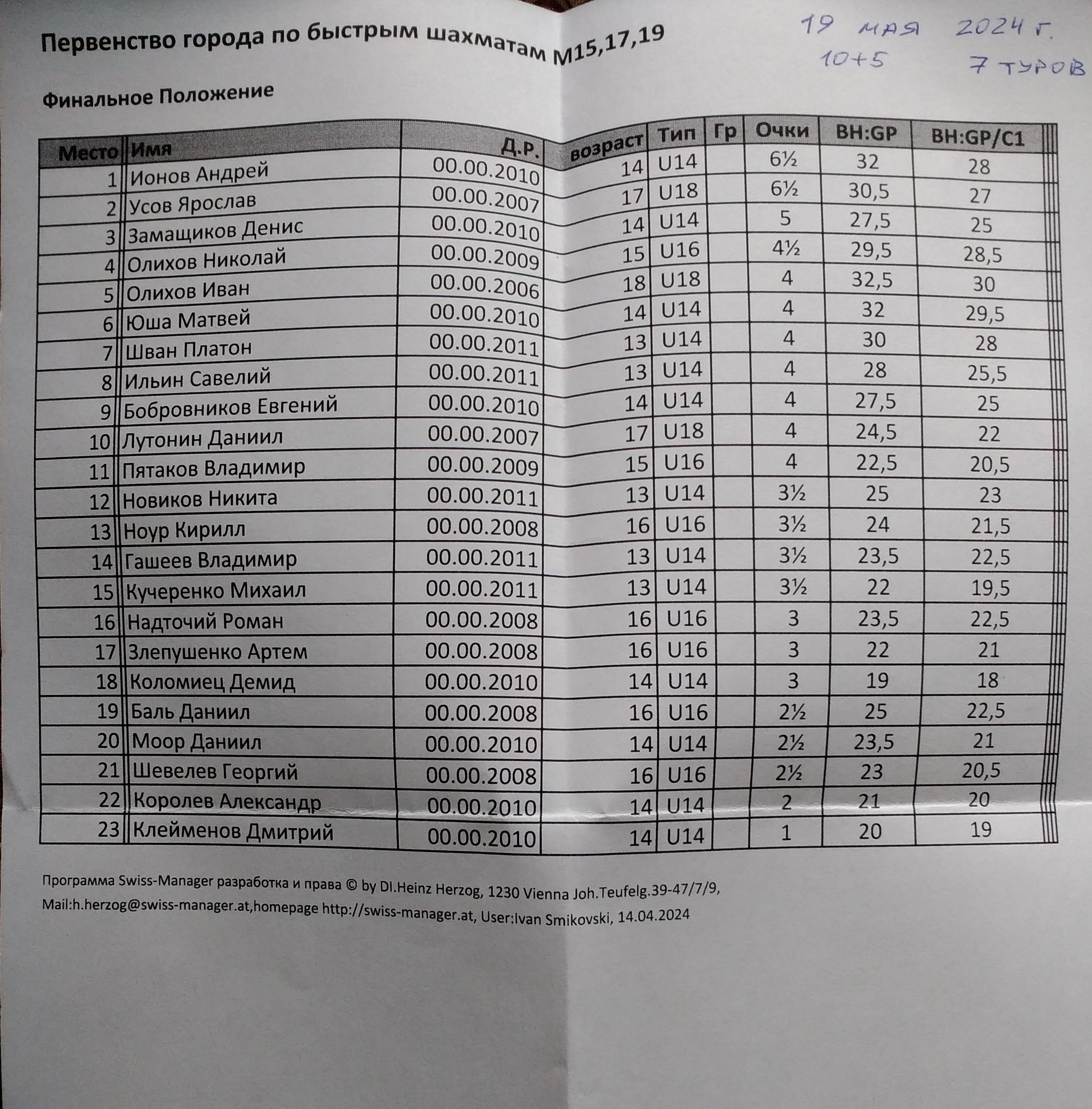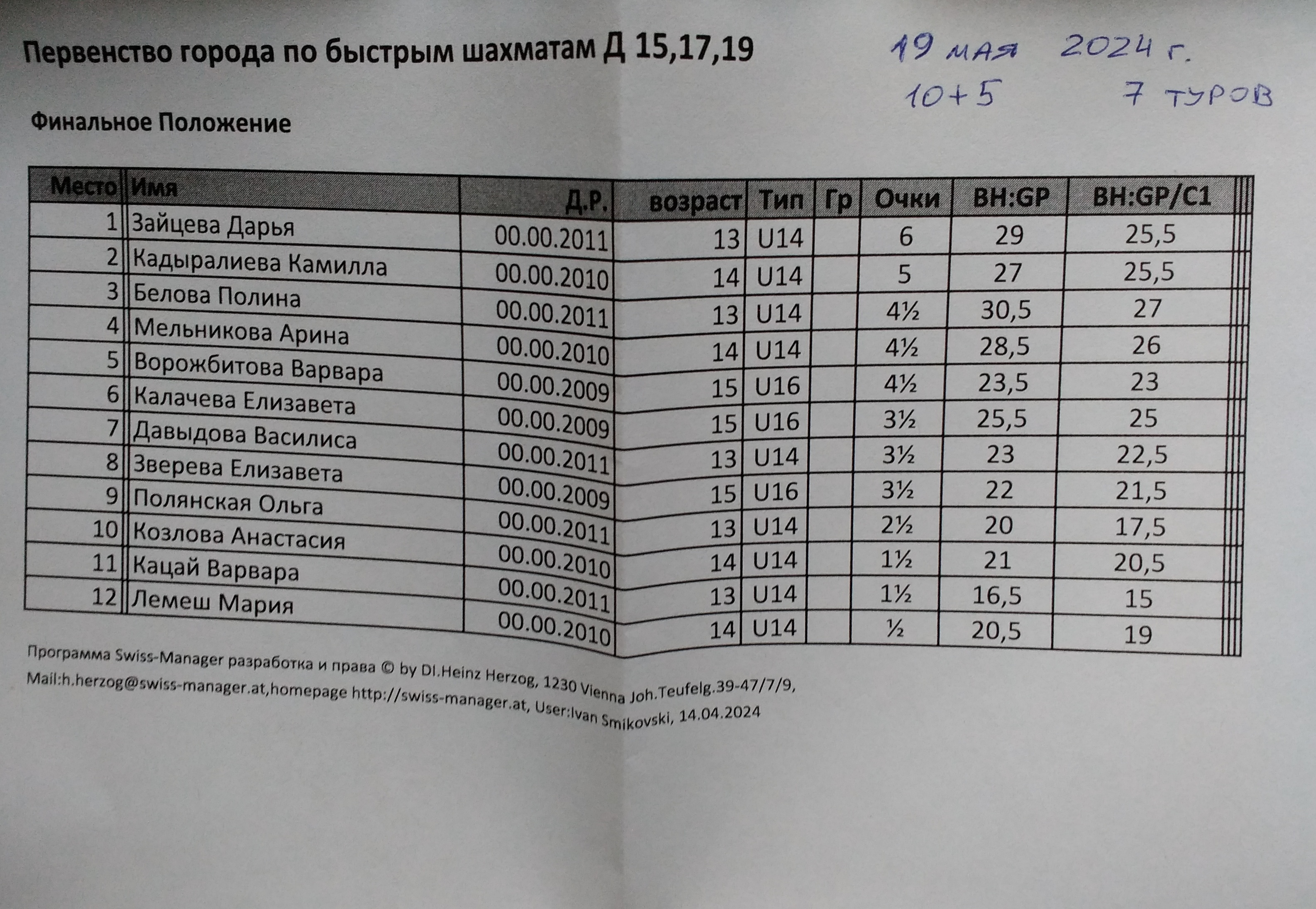 В Спортивной школе №15 в воскресенье, 19 мая 2024 года, прошло Первенство города Омска среди юношей и девушек до 15, до 17, до 19 лет по быстрым шахматам. Мальчики и девочки играли в отдельных турнирах, возрастные группы были объединены. К участию допускались шахматисты 2006-2011 года рождения. Контроль 10+5. Туров 7.