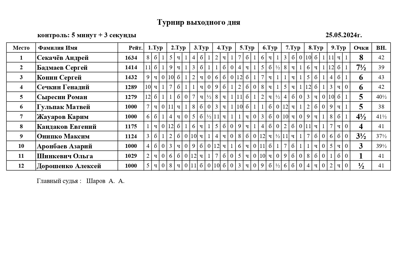 В ГШК на Дмитриева 25 мая 2024 года прошел субботний блиц для всех желающих. Контроль 5+3. Туров 9. Количество участников 12.