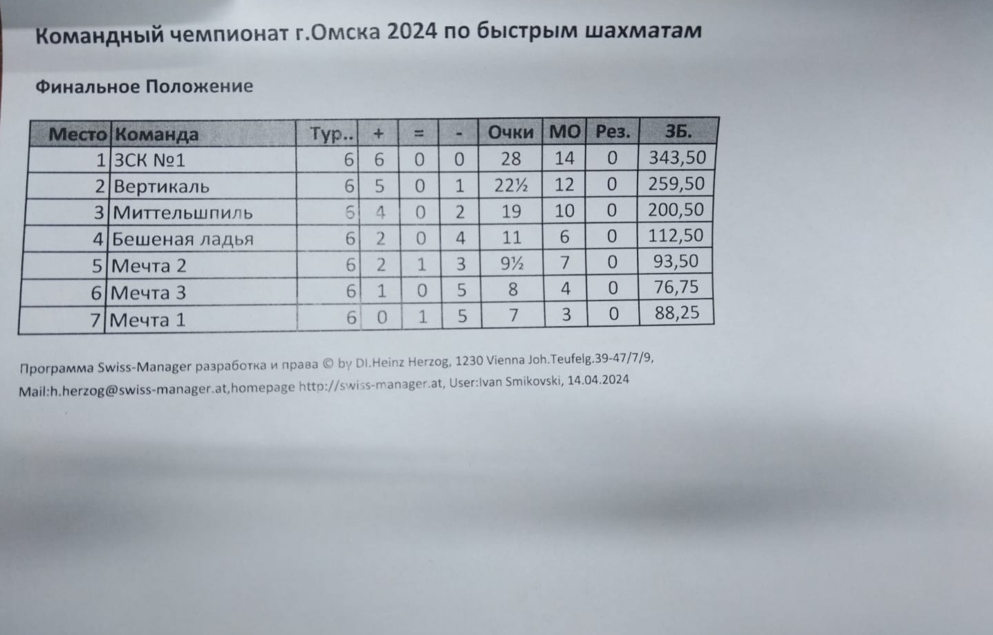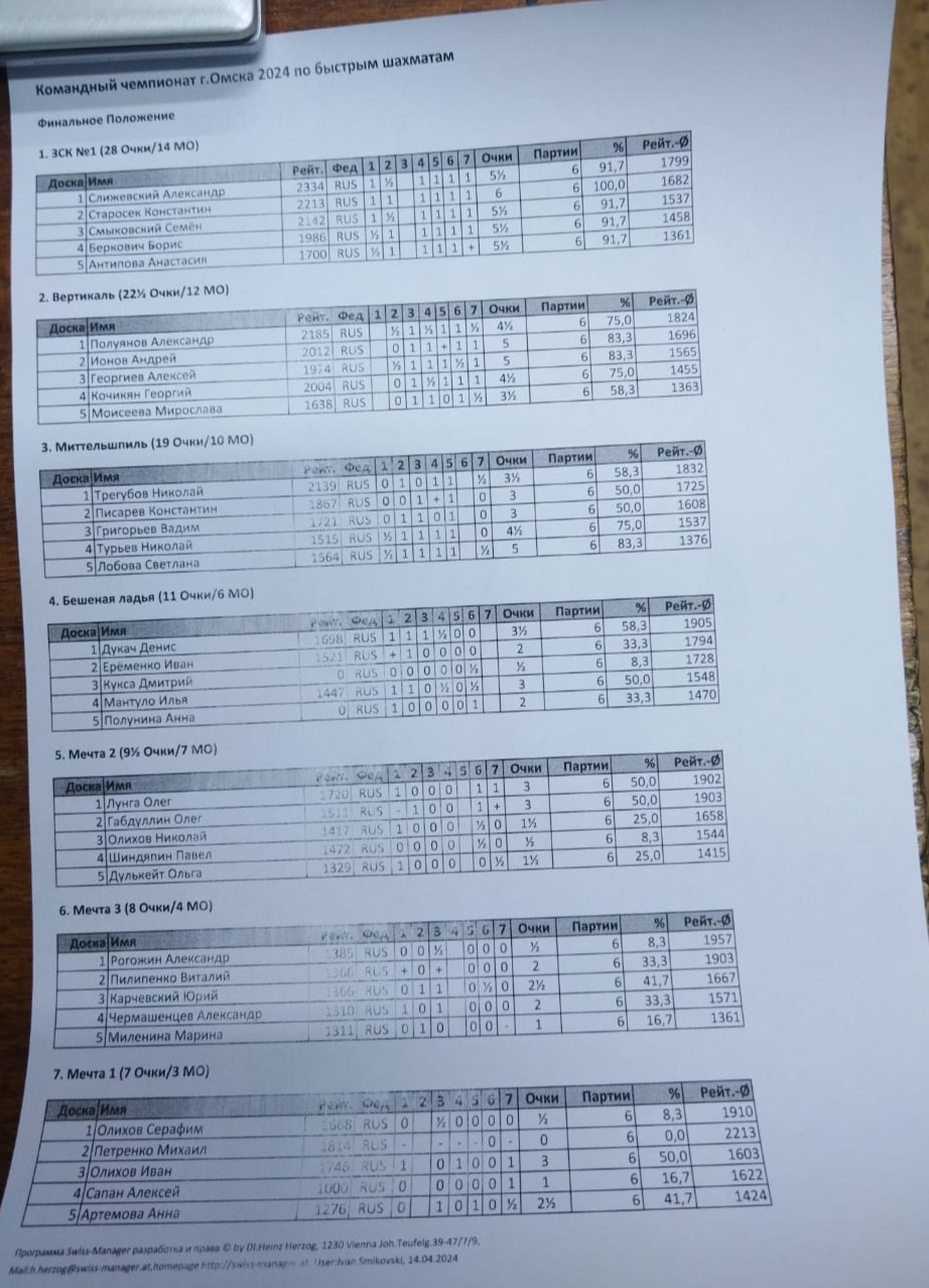 В Спортивной школе №15 состоялся Командный чемпионат города Омска по быстрым шахматам 2024 года. Состав команды: 4 мужских доски + 1 женская доска. Контроль 10+5. Количество команд 7. Круговая система.
