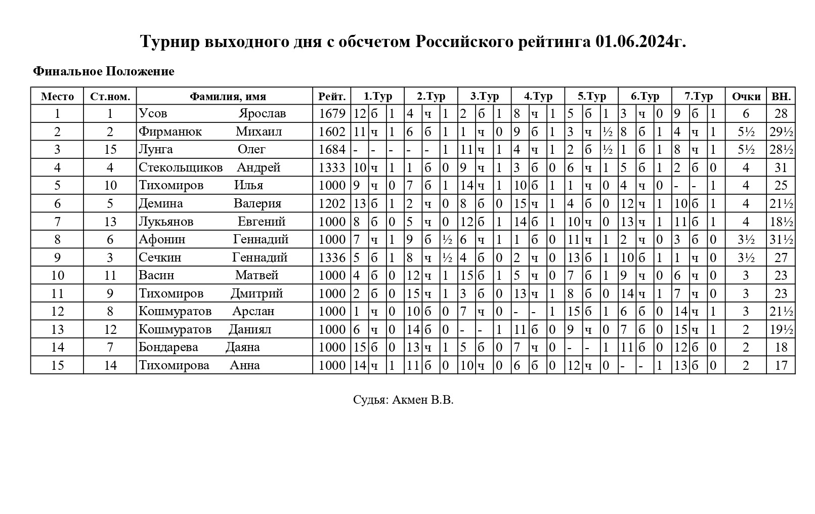 В ГШК на Дмитриева в субботу, 1 июня 2024 года, прошел блиц-турнир для всех желающих. Контроль 5+3. Туров 7. Количество участников 15.