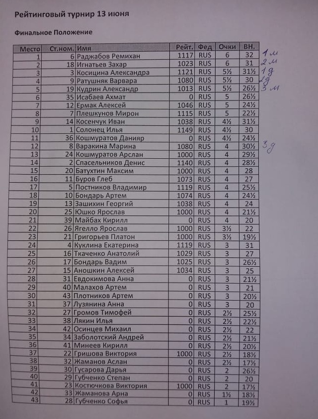 Дата: 13.06.2024 Место проведения: ГШК на Дмитриева. Участники: воспитанники СШ №15 и юные шахматисты из ГШК. Требования: рейтинг ФШР до 1150. Контроль 8+3. Туров 7. Количество участников 43.
