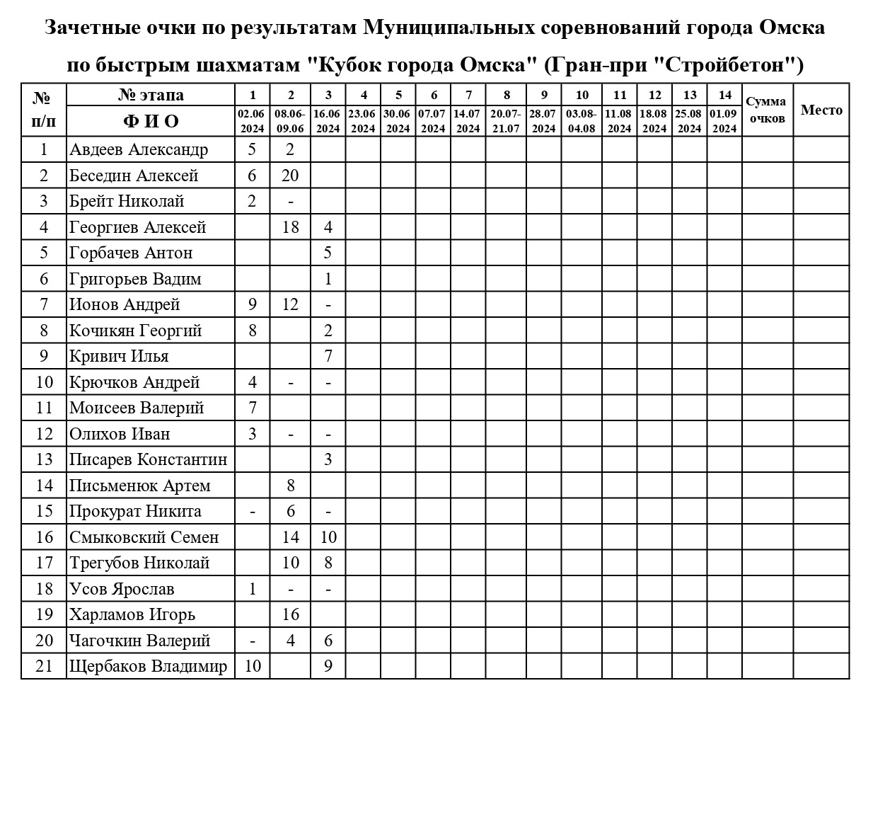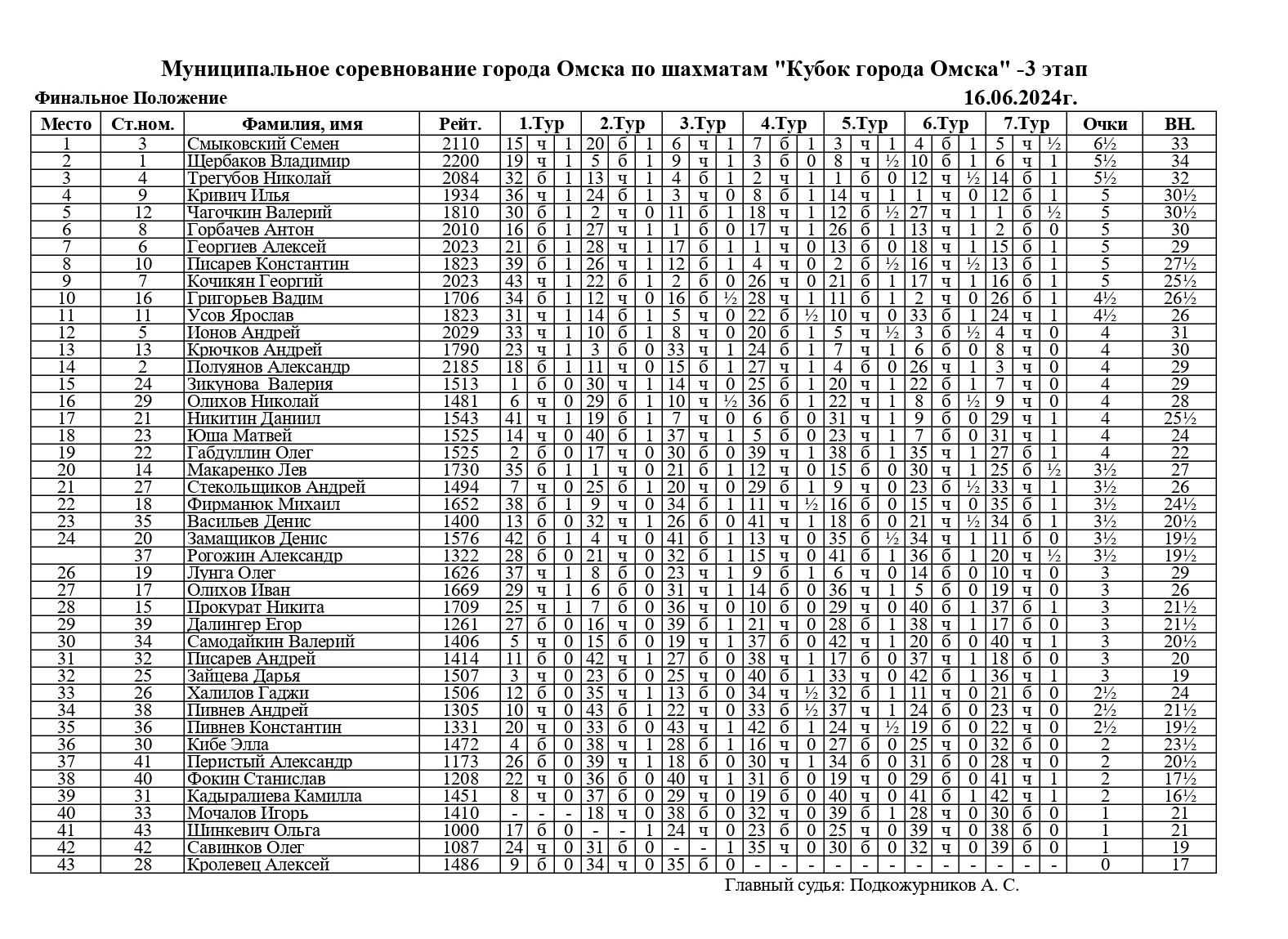 В воскресенье, 16 июня 2024 года, прошел третий этап «Кубка города Омска» - Гран-при «Стройбетон» по быстрым шахматам. Ограничения по рейтингу: ФШР выше 1200. Место проведения: ГШК на Дмитриева. Контроль 10+5. Туров 7. Количество участников 43.