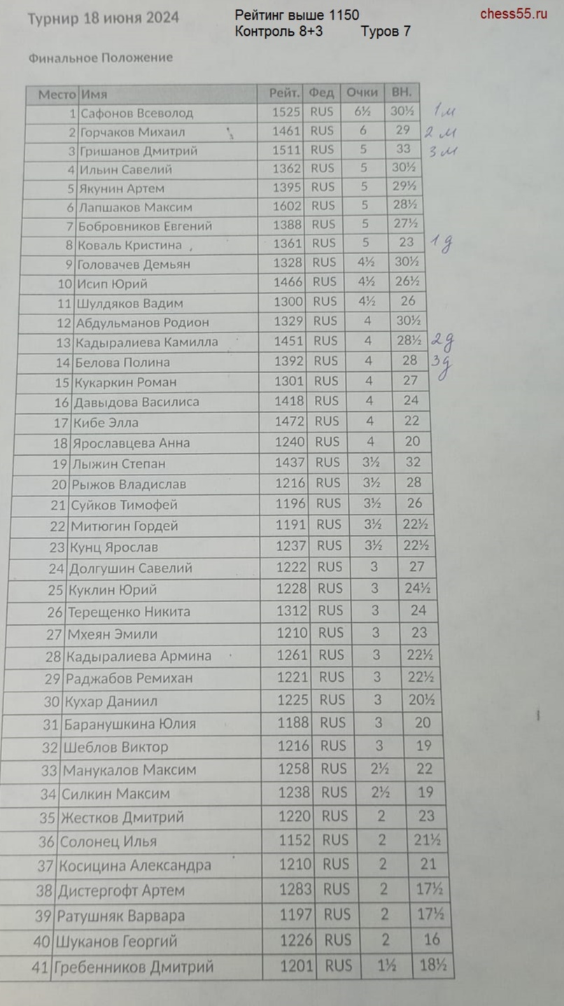 Дата: 18.06.2024 Место проведения: филиал ГШК на Масленникова. Участники: воспитанники СШ №15 и юные шахматисты из ГШК. Требования: рейтинг ФШР 1150 и выше. Контроль 8+3. Туров 7. Количество участников 41.