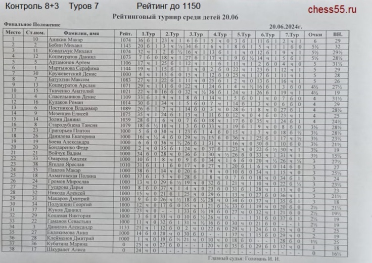 Дата: 20.06.2024 Место проведения: ГШК на Дмитриева. Участники: воспитанники СШ №15 и юные шахматисты из ГШК. Требования: рейтинг ФШР до 1150. Контроль 8+3. Туров 7. Количество участников 38.