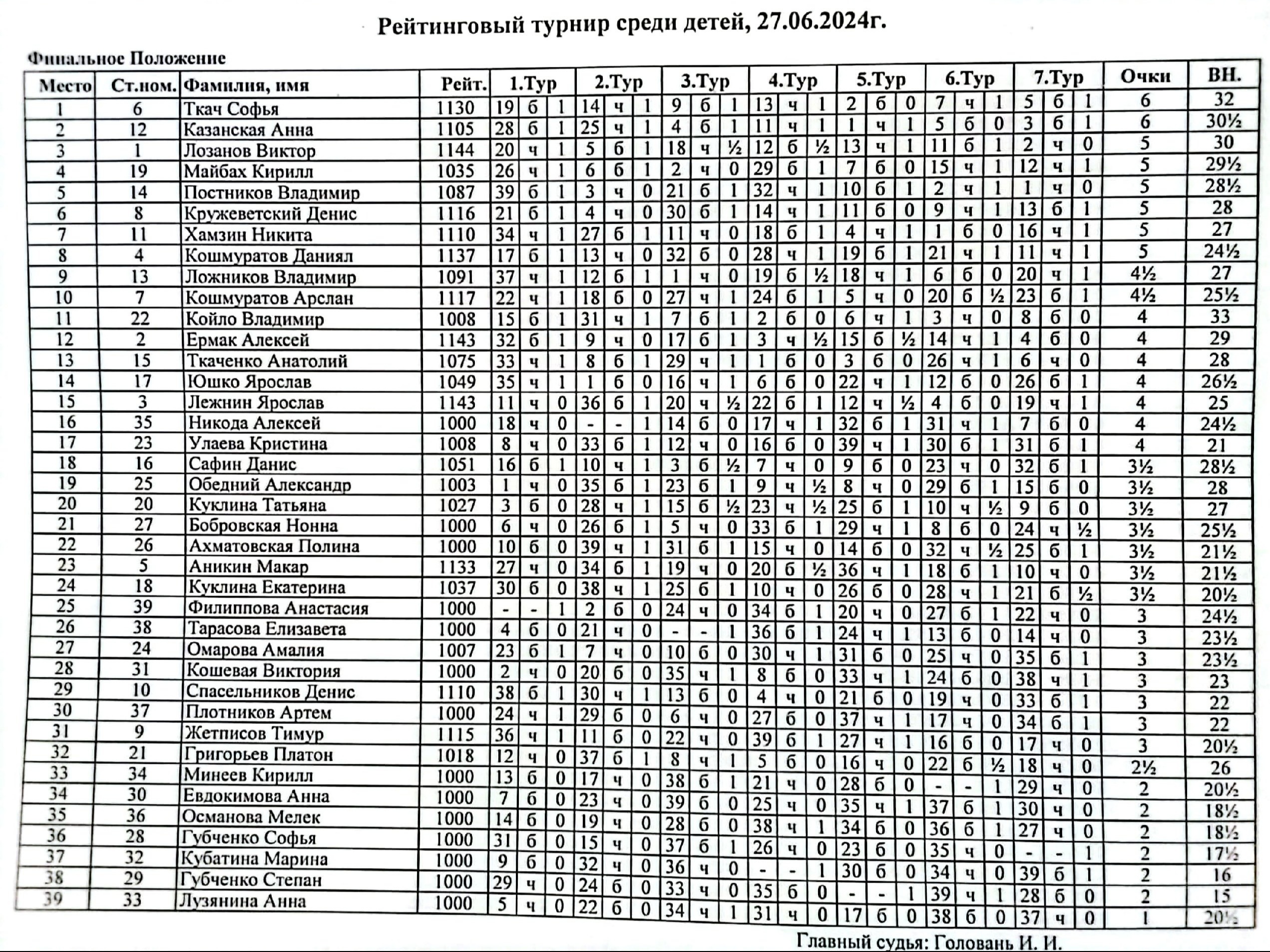 Дата: 27.06.2024 Место проведения: ГШК на Дмитриева. Участники: воспитанники СШ №15 и юные шахматисты из ГШК. Требования: рейтинг ФШР до 1150. Контроль 8+3. Туров 7. Количество участников 39.