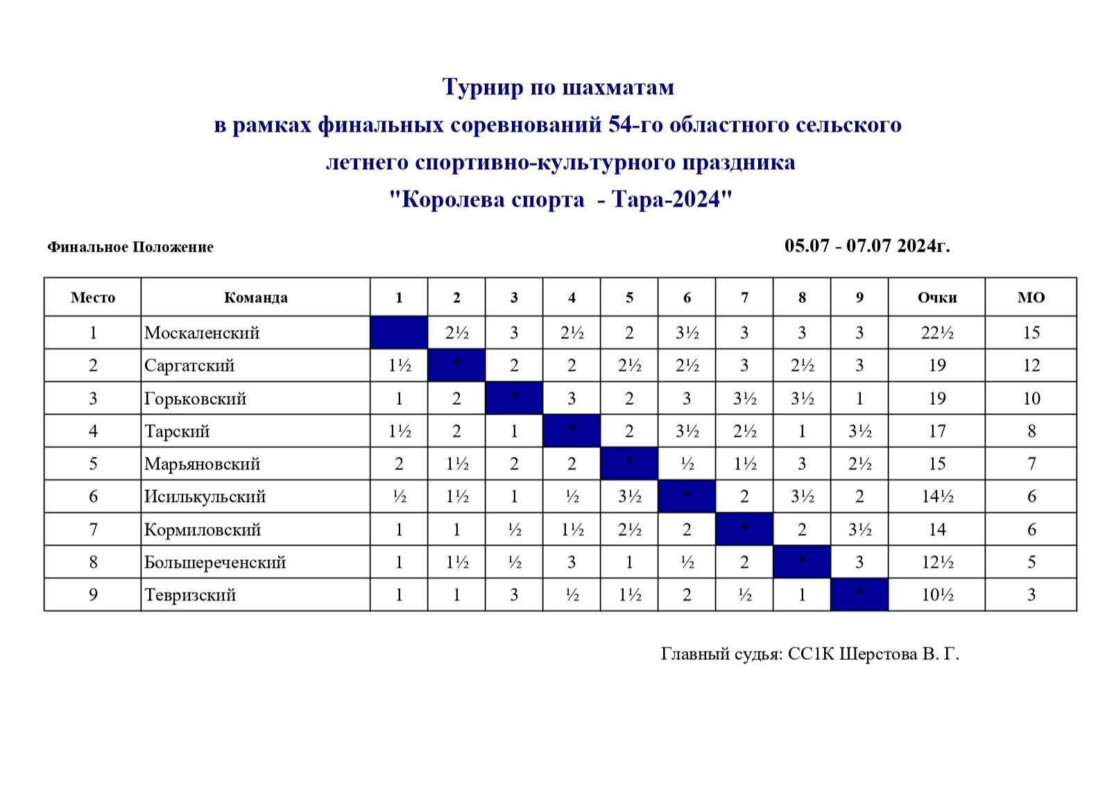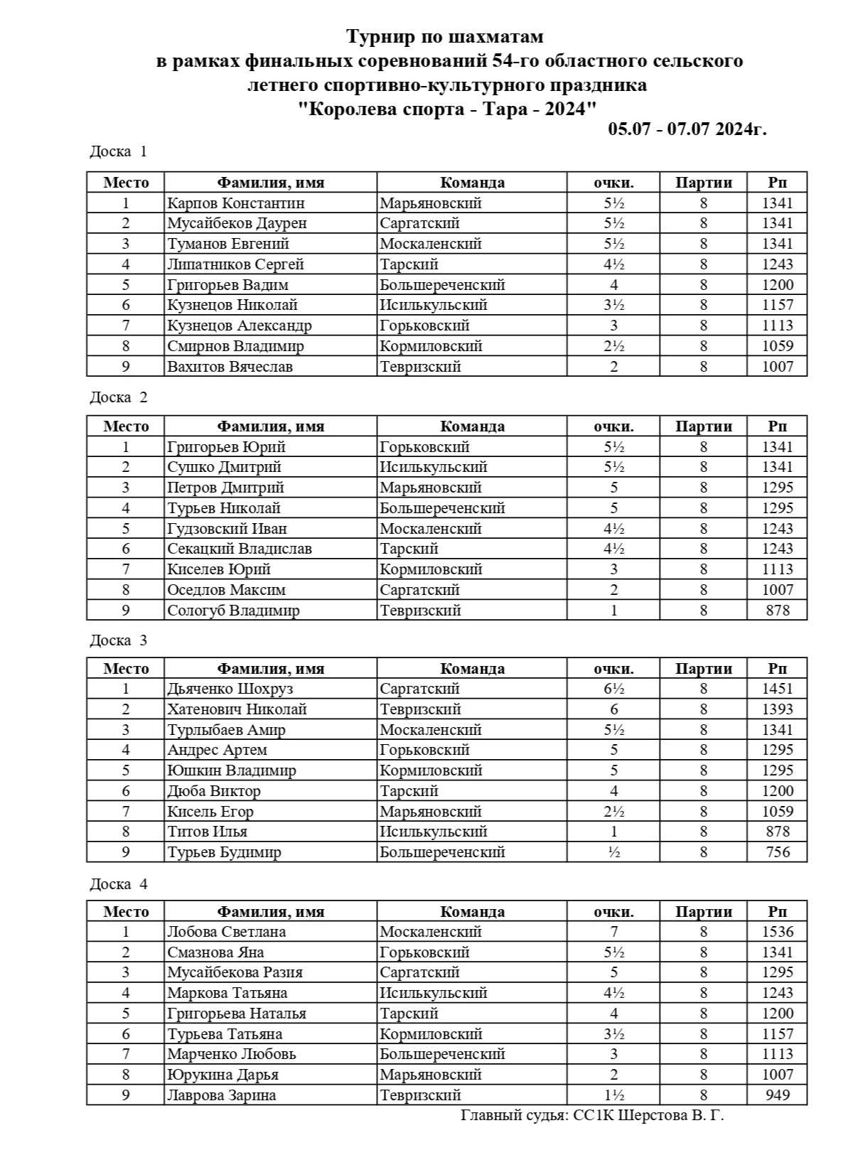 С 5 июля по 7 июля 2024 года в Омской области прошли финальные соревнования по шахматам в зачет 54-го областного сельского летнего спортивно-культурного праздника «Королева спорта — Тара-2024». Состав команды: 2 мужских доски + 1 юниор (2007 г.р. и младше) + 1 женская доска. В финале «Королевы спорта» играли по 4 сильнейших команды области из северной и южной зоны, а также команда хозяев турнира из Тарского района.