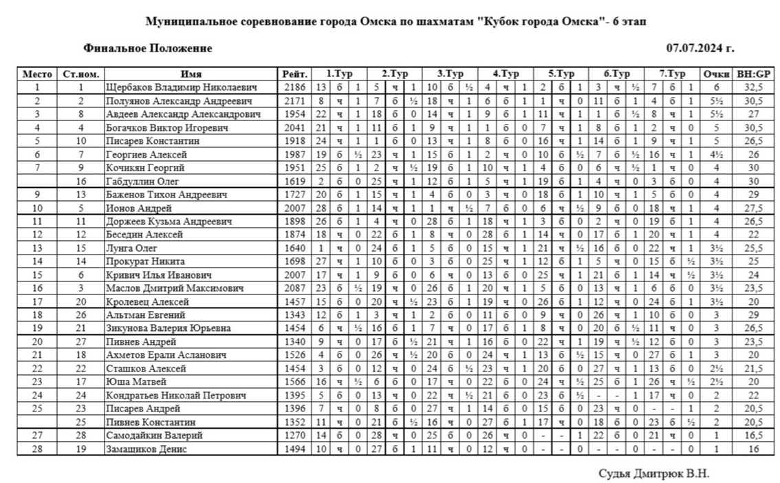 В Омском городском шахматном клубе, 7 июля 2024 года, прошел шестой этап «Кубка города Омска» - Гран-при «Стройбетон» по быстрым шахматам. Ограничения по рейтингу: ФШР выше 1200. Место проведения: ГШК на Дмитриева. Контроль 10+5. Туров 7. Количество участников 28.