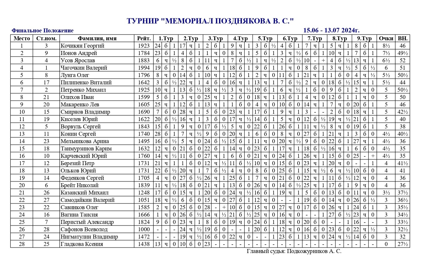 С 15 июня по 13 июля 2024 года в филиале ГШК на Масленникова по средам и субботам проходил «Мемориал Владимира Сергеевича Позднякова» по классическим шахматам. Контроль 90+30. Количество участников 28. Туров 9.