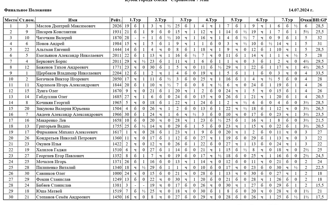 В Омском городском шахматном клубе, 14 июля 2024 года, состоялся седьмой этап «Кубка города Омска» - Гран-при «Стройбетон» по быстрым шахматам. Ограничения по рейтингу: ФШР выше 1200. Место проведения: ГШК на Дмитриева. Контроль 10+5. Туров 7. Количество участников 30.