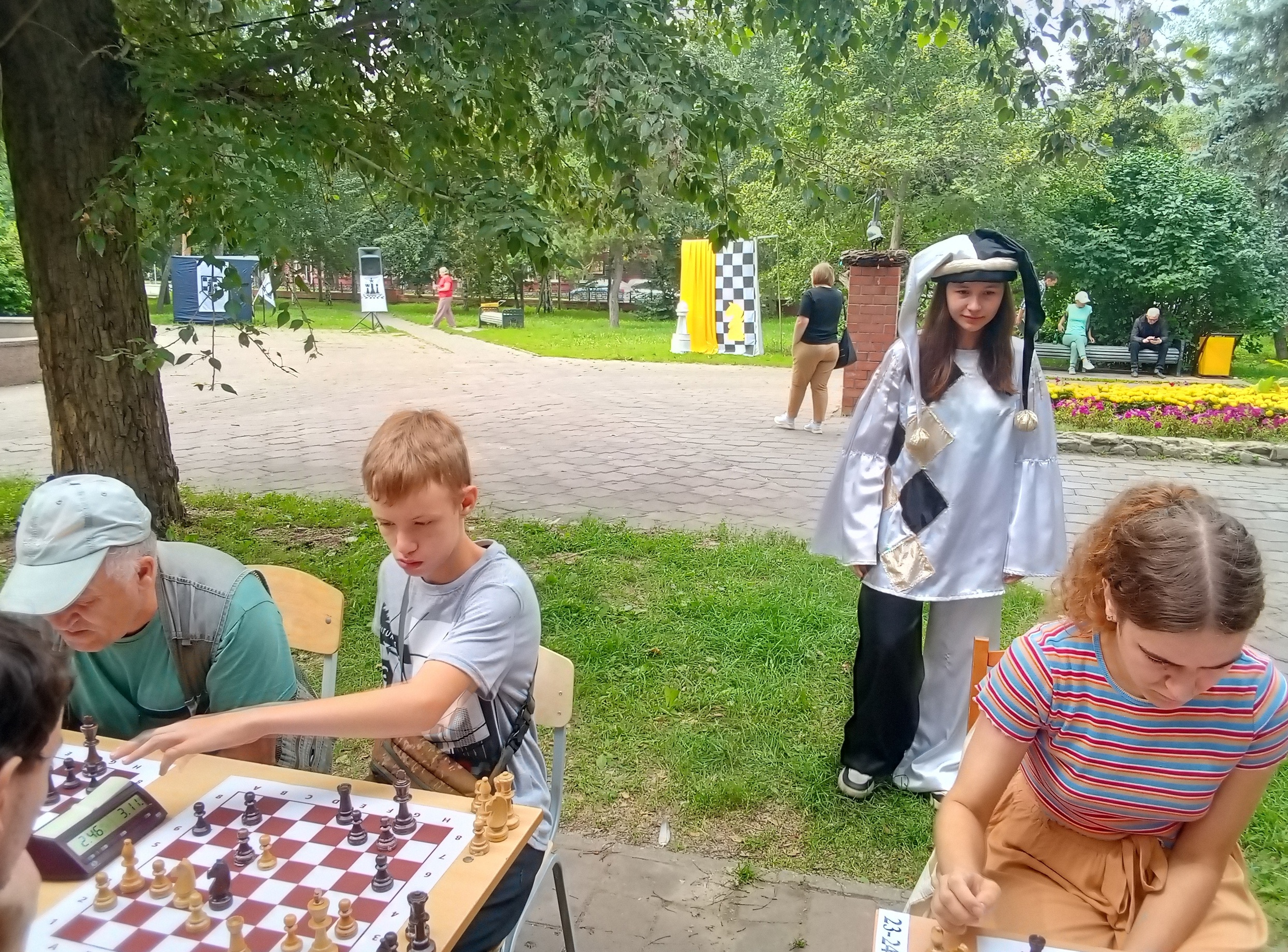 А утром в сквере А.К.Серова все желающие традиционно играли в блиц у Администрации Ленинского административного округа города Омска. Шахматы входят в программу фестиваля настольных логических игр «В замке Королевы», который проходит в День города.