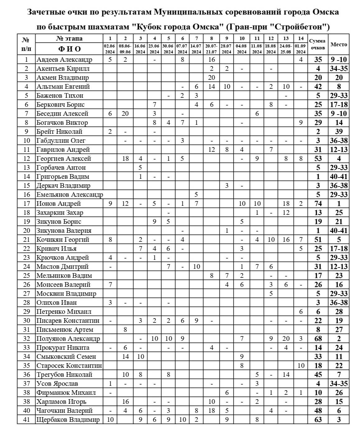 Таким образом, по итогам серии летних турниров по быстрым шахматам «Стройбетон» определились участники финала, набравшие наибольшее количество зачетных очков: Андрей Ионов, Александр Полуянов, Владимир Щербаков, Алексей Георгиев, Георгий Кочикян, Валерий Чагочкин, Николай Трегубов, Евгений Альтман, Александр Авдеев, Алексей Беседин, Семён Смыковский, Дмитрий Маслов, Андрей Гаврилов.