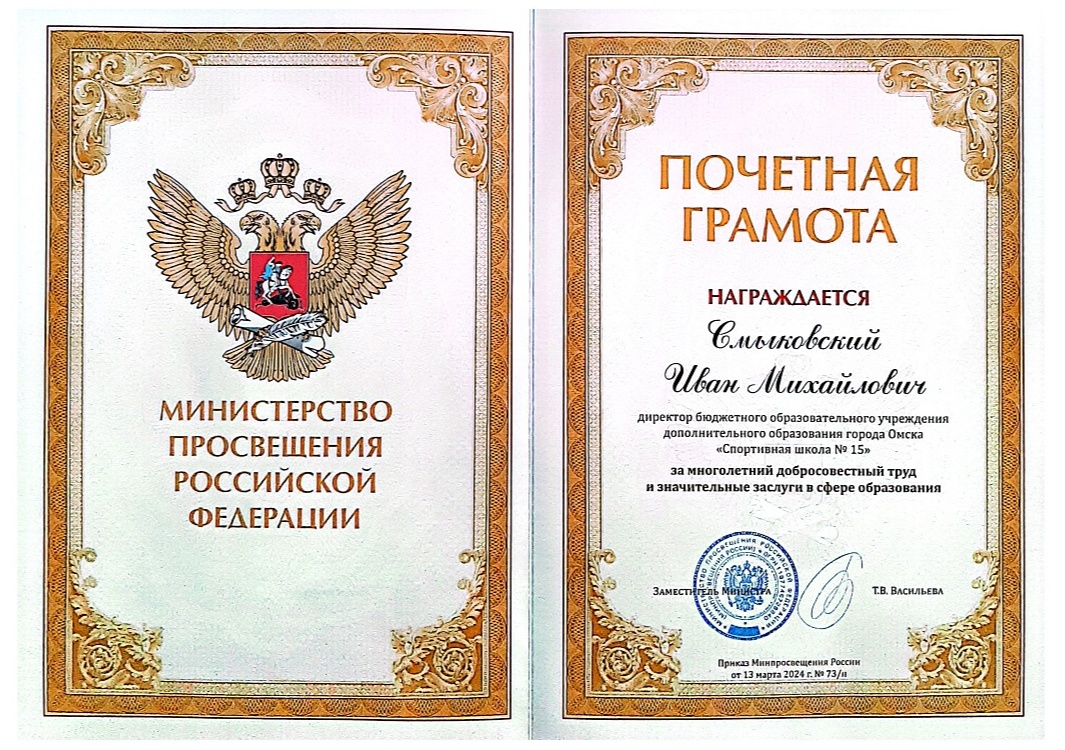 Почетную грамоту «за многолетний добросовестный труд и значительные заслуги в сфере образования» вручили директору Спортивной школы №15 города Омска Ивану Михайловичу Смыковскому.