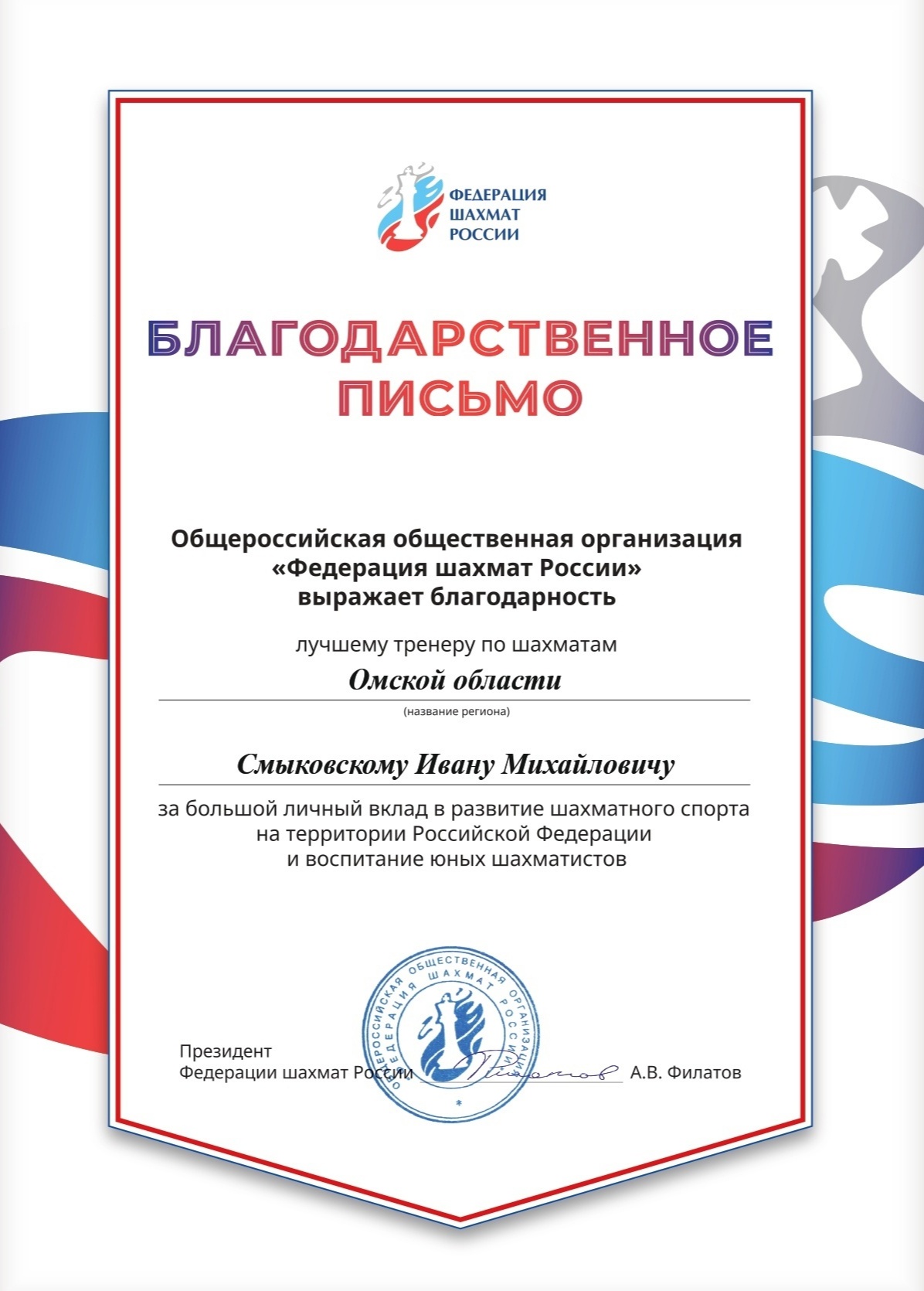 Ранее вклад вице-президента Федерации шахмат Омской области И.М.Смыковского в развитие шахматного движения в стране и подготовку юных спортсменов был отмечен Федерацией шахмат России. В тексте благодарственного письма, переданного лучшему тренеру по шахматам Омской области в начале 2024 года, говорится: «за большой личный вклад в развитие шахматного спорта на территории Российской Федерации и воспитание юных шахматистов».