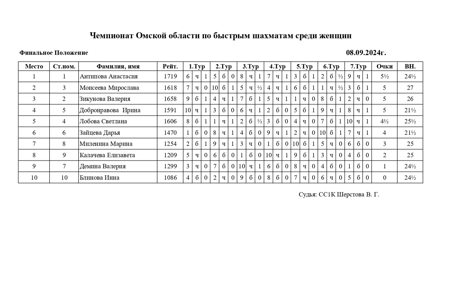 В шахматном клубе на Дмитриева 8 сентября 2024 года состоялся Чемпионат Омской области по быстрым шахматам среди женщин. Контроль 10+5. Туров 7. Количество участниц 10.