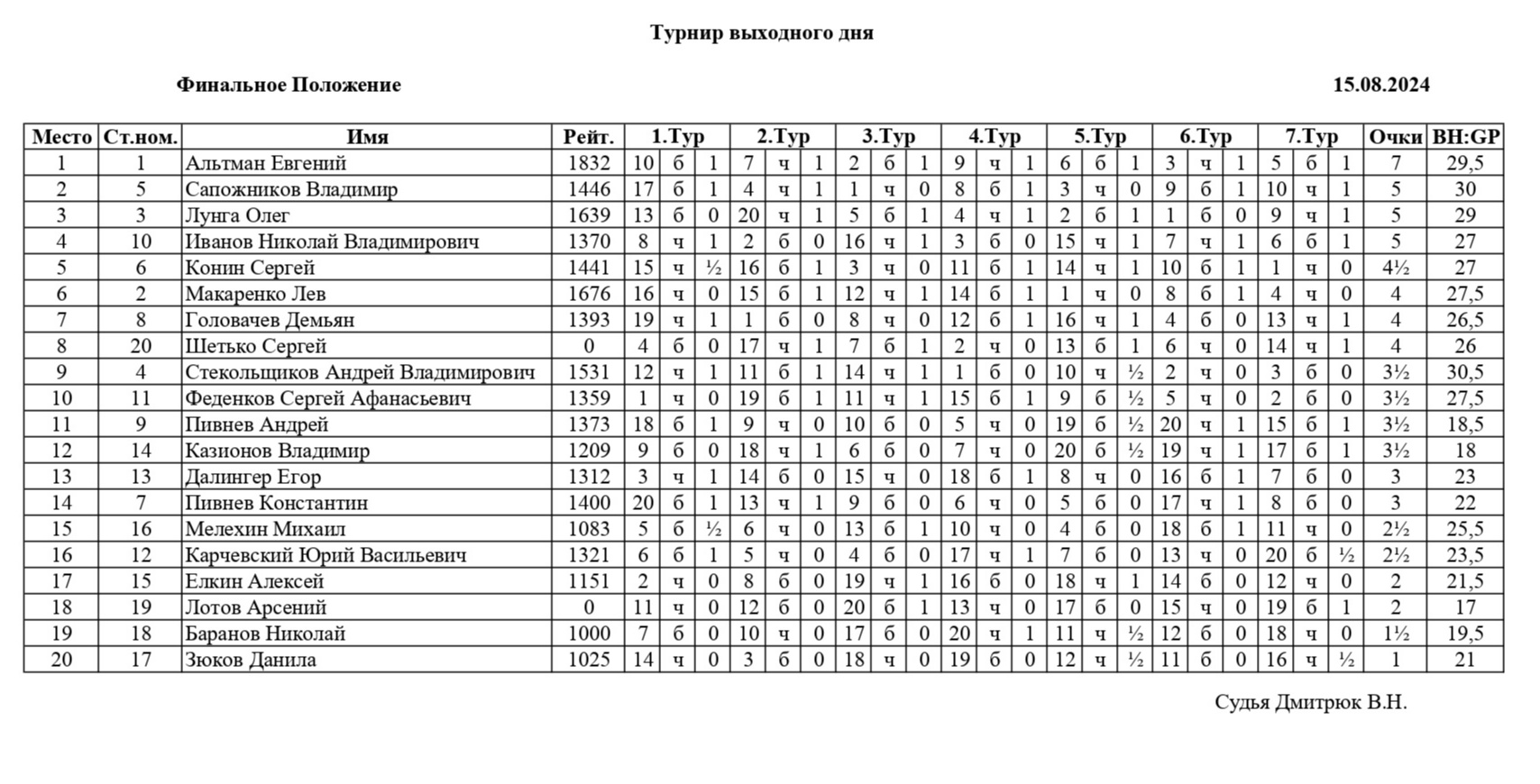 В воскресенье, 15 сентября 2024 года, на Дмитриева прошел турнир выходного дня по быстрым шахматам для всех желающих. Контроль 10+5. Туров 7. Количество участников 20.