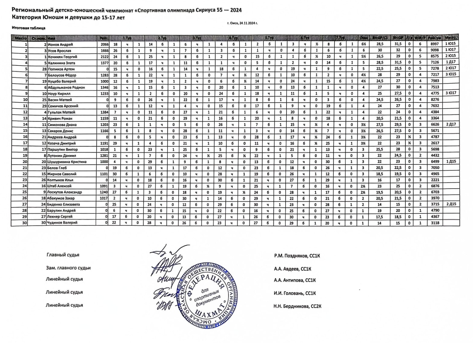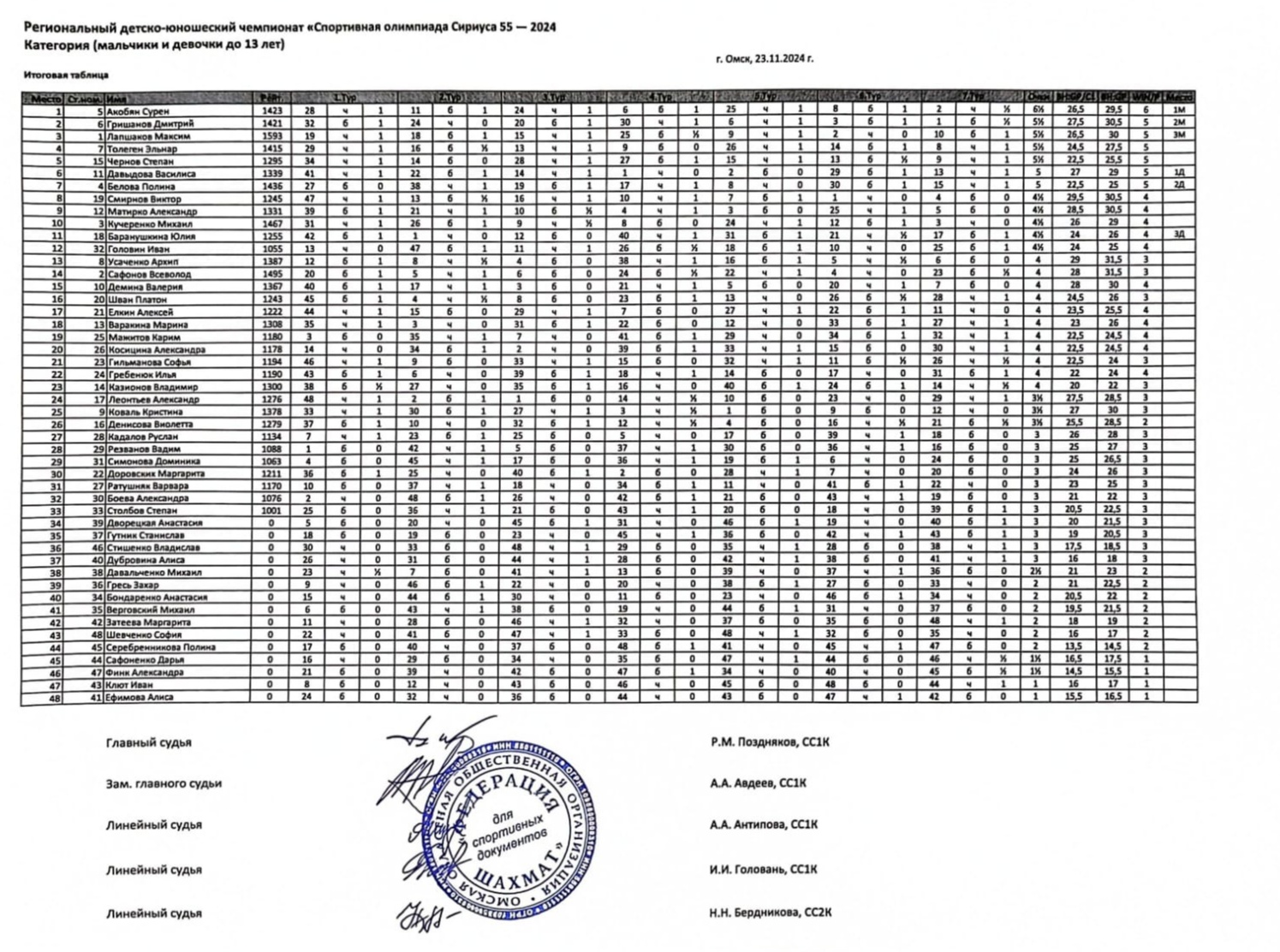 На базе Спортивной школы №15 прошел региональный детско-юношеский чемпионат по быстрым шахматам «Спортивная олимпиада Сириуса 55-2024». К участию в соревнованиях допускались учащиеся 2007-2013 года рождения города Омска и районов Омской области. Контроль 8+3. Туров 7.
