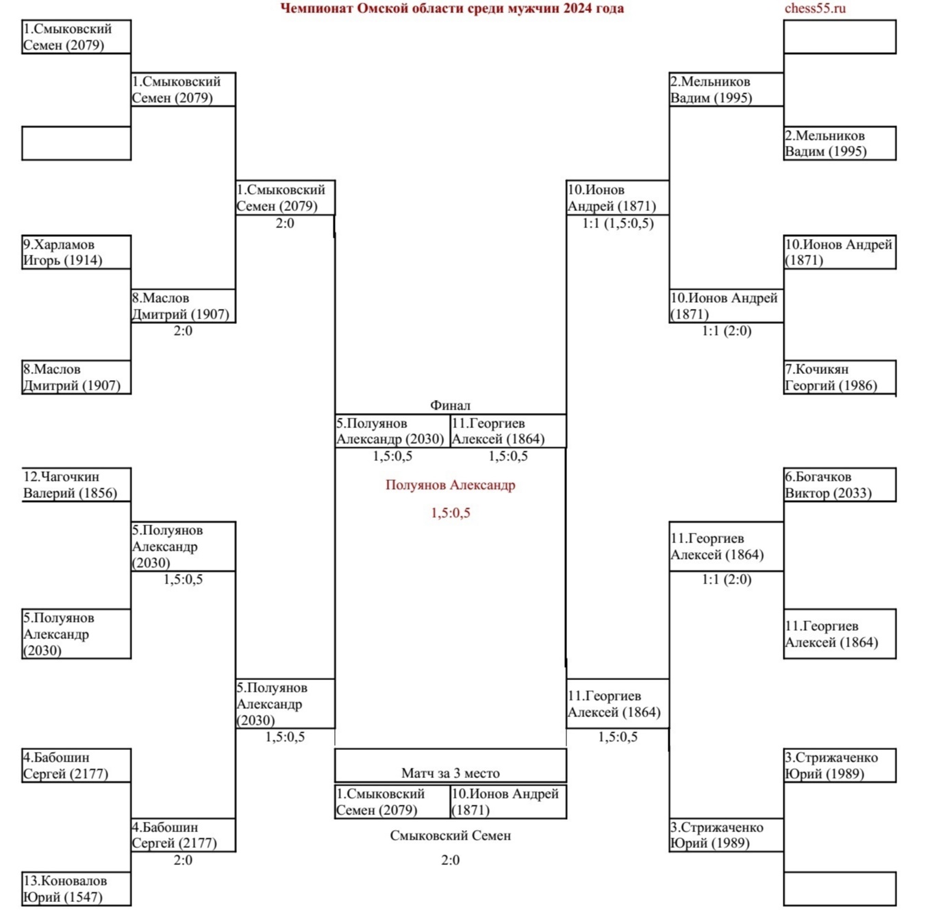14-15 декабря, в матче за 1 место Александр Полуянов со счетом полтора на пол-очка победил Алексея Георгиева и стал чемпионом Омской области среди мужчин 2024 года.