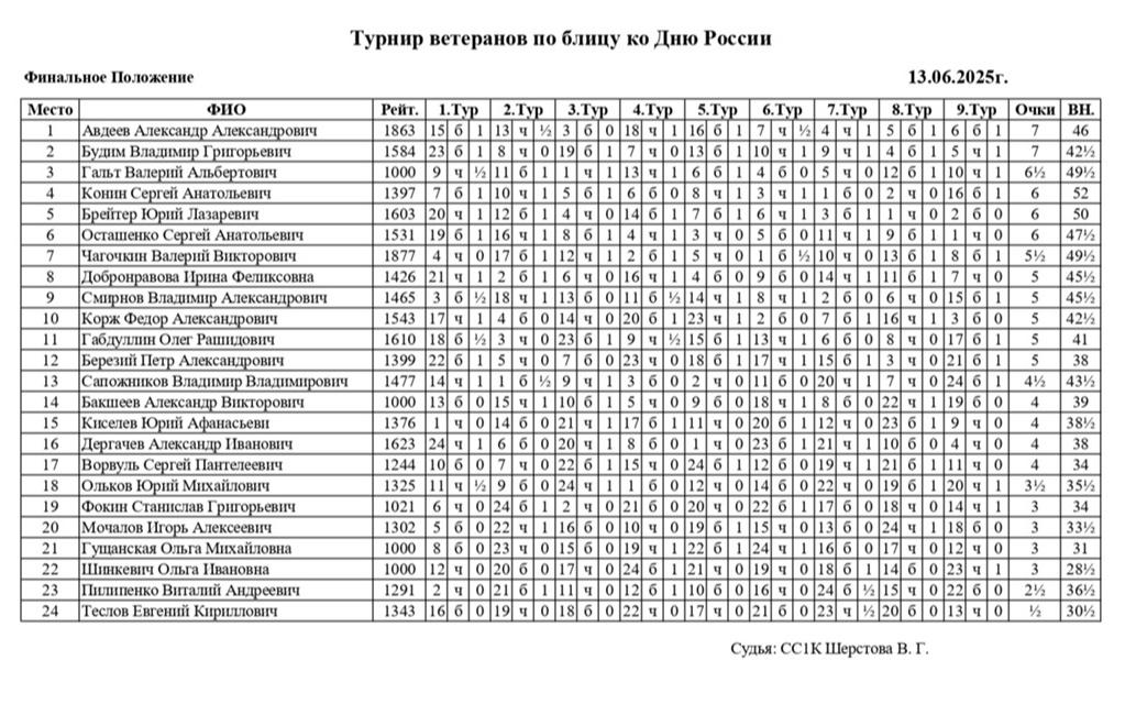 13 июня в филиале Спортивной школы №15 на Масленникова ветераны играли в блиц с контролем 5+3 в 9 туров. Количество участников 24.