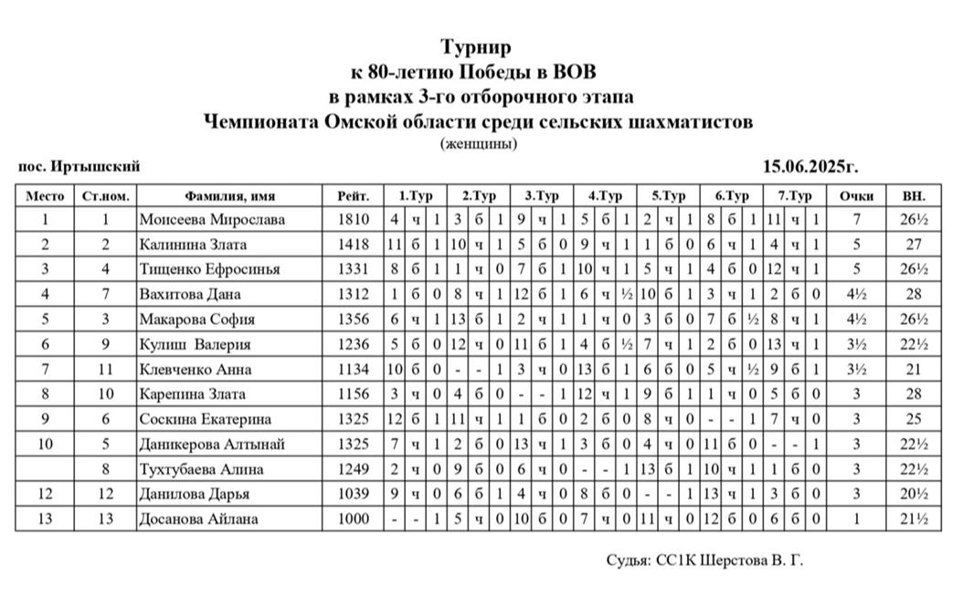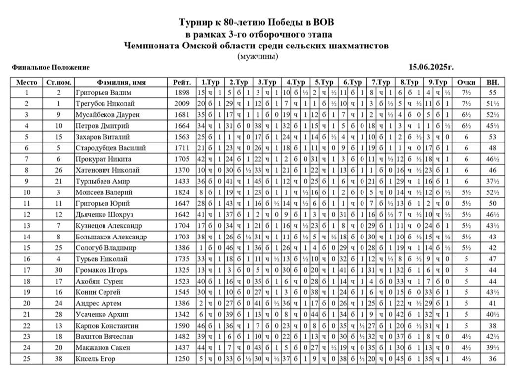 15 июня в поселке Иртышский Омского района прошел третий этап Чемпионата Омской области среди сельских шахматистов среди мужчин и женщин. Контроль 10+5.