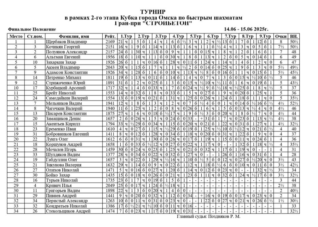 14-15 июня 2025 года на Масленникова прошел второй «золотой» этап Гран-при «Стройбетон» по быстрым шахматам. Контроль 10+5. Туров 9. Количество участников 34.