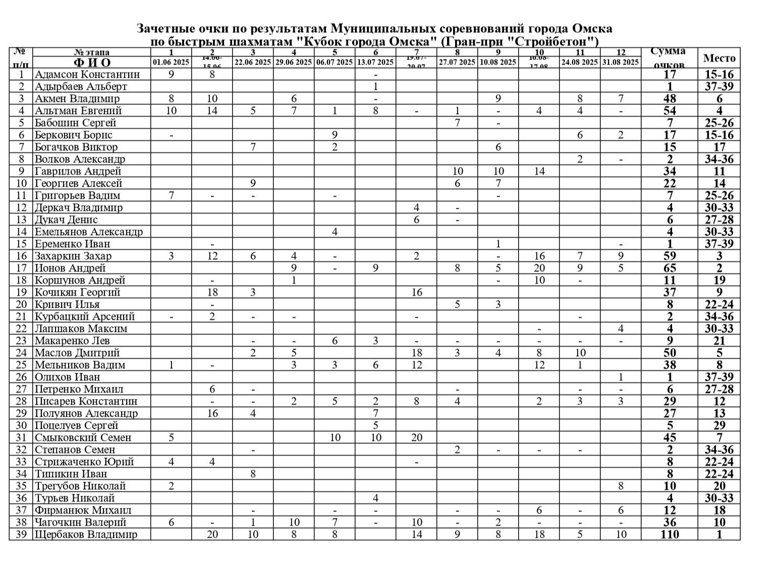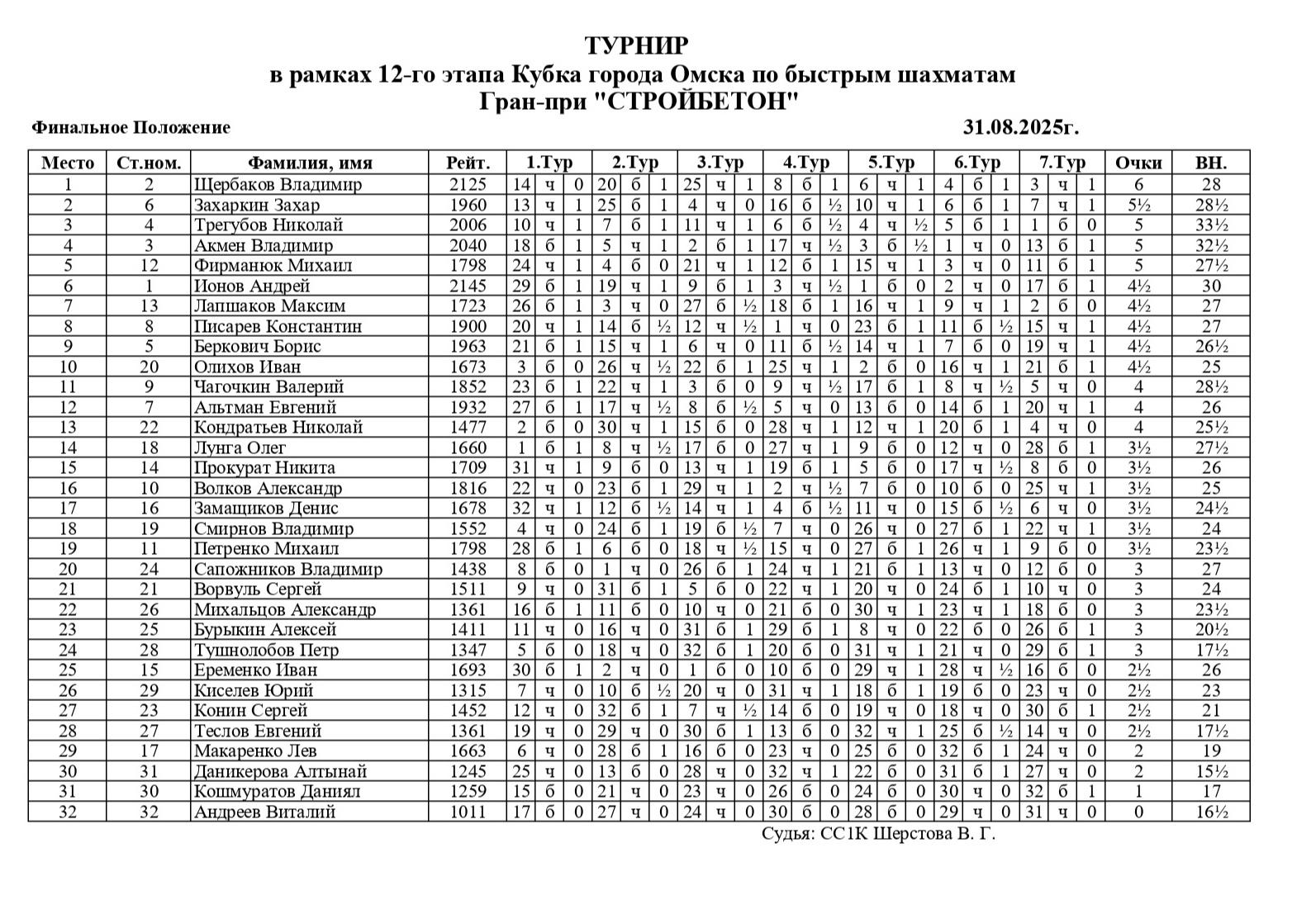 В филиале Спортивной школы №15 на Масленникова 31 августа 2025 года прошел заключительный двенадцатый этап «Стройбетона» по быстрым шахматам. Контроль 10+5. Туров 7. Количество участников 32.