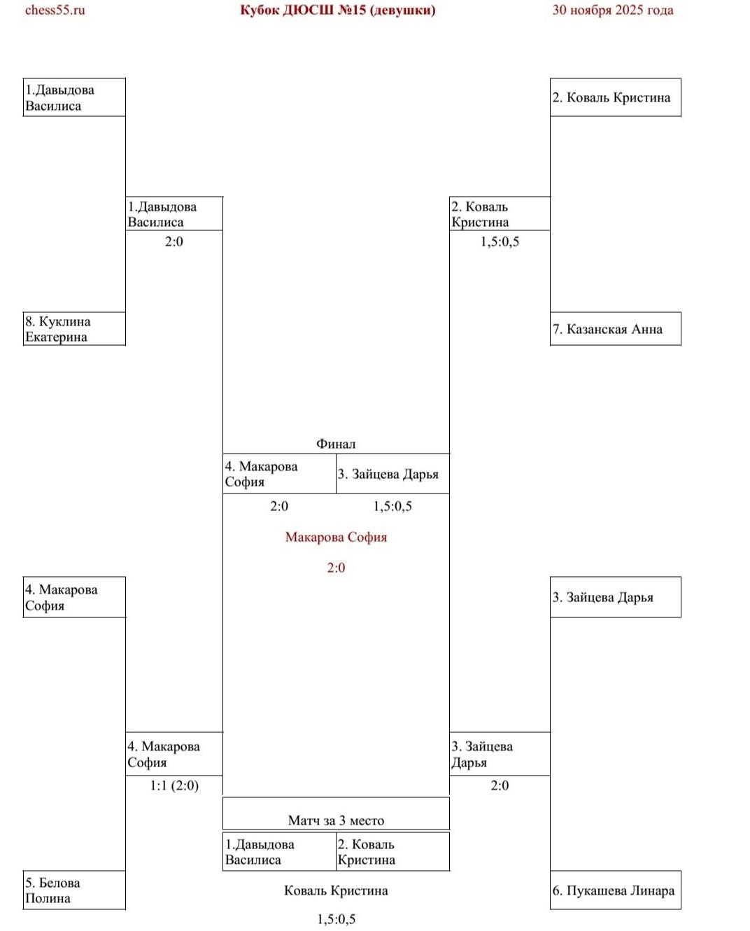 В воскресенье, 30 ноября 2025 года, за право владения кубком в течение года боролись девушки. Восемь участниц играли с контролем 10+5. Если две партии в быстрые шахматы не позволяли выявить сильнейшую, то далее игрались две партии в блиц с контролем 3+2. Они понадобились победительнице Кубка ДЮСШ Софии Макаровой, чтобы пройти Полину Белову на пути в четверку.