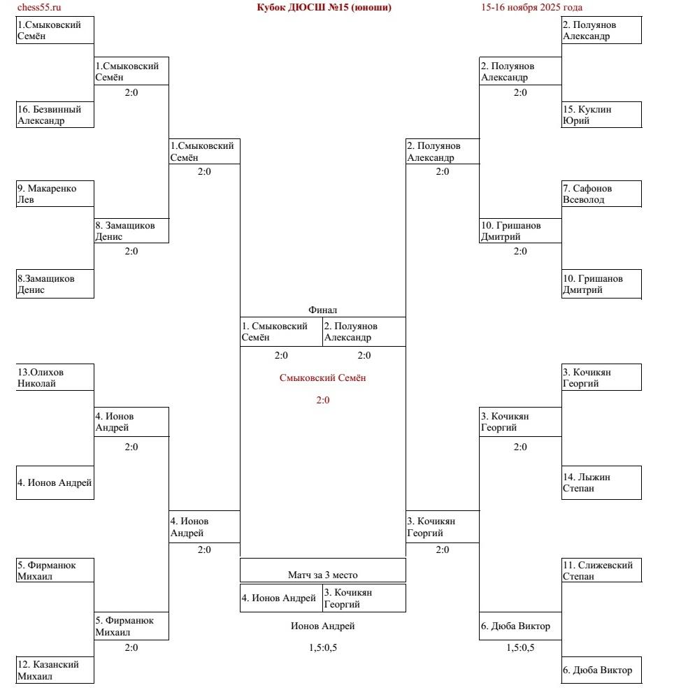 Первыми, 15-16 ноября 2025 года, за кубок ДЮСШ боролись юноши. 16 человек играли на вылет по олимпийской системе с контролем 15+10. В этом году матчи в блиц и армагеддон для определения победителей не понадобились, юноши все решили в быстрых шахматах.