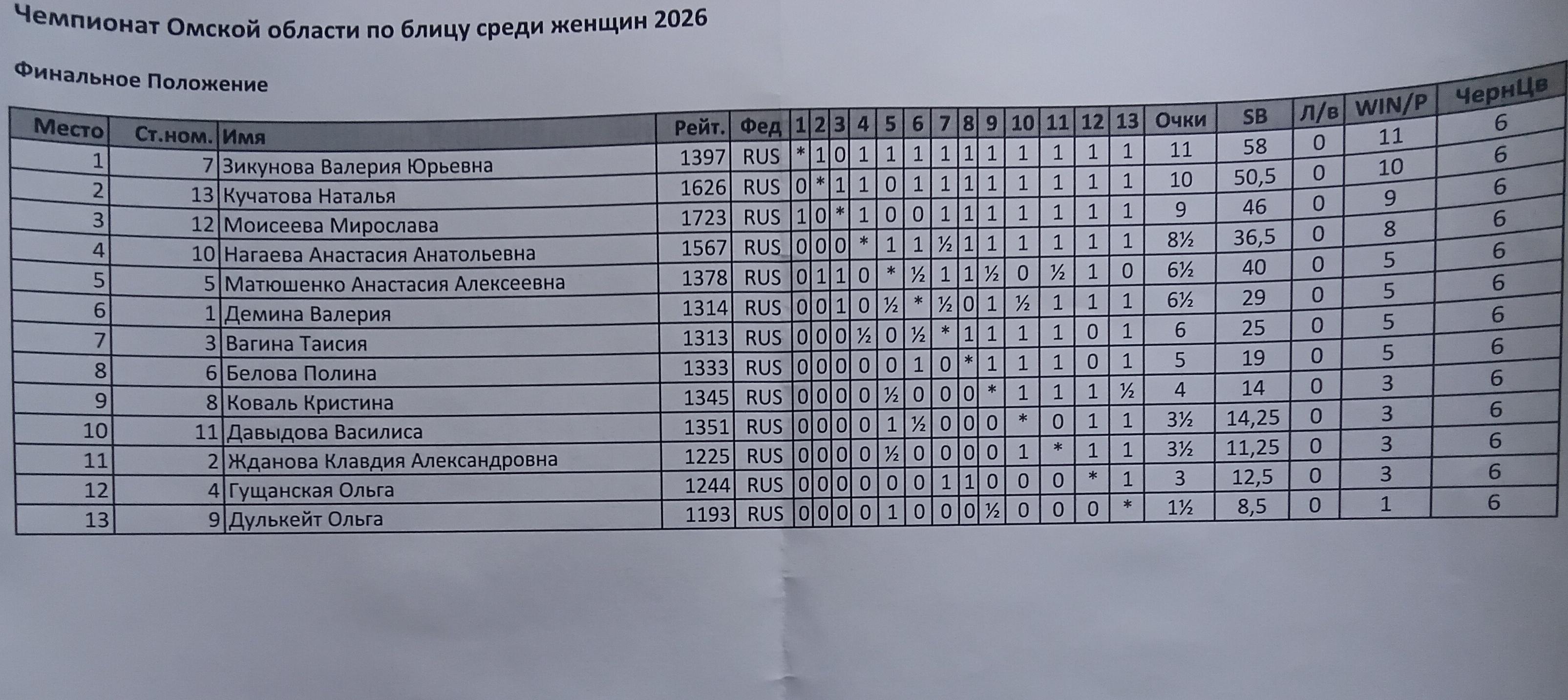 В Спортивной школе №15 на Герцена 26 апреля 2026 года прошел чемпионат Омской области по блицу среди женщин. 13 шахматисток играли по круговой системе с контролем 3+2.